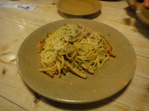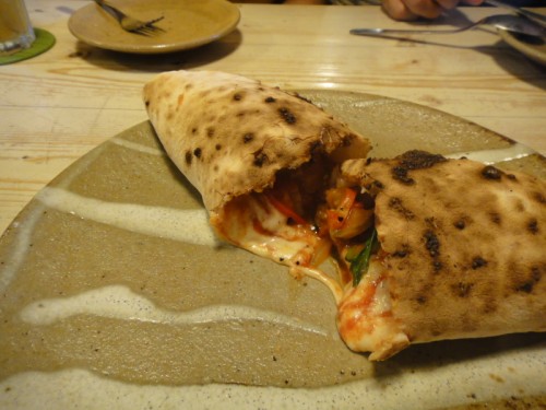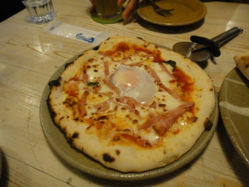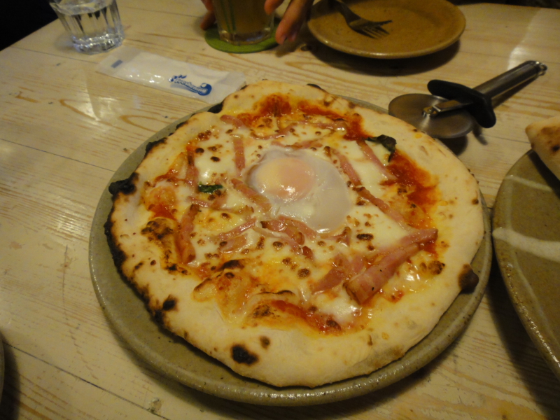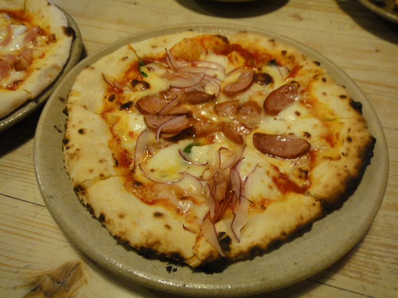 前回参加メンバーの僕と9ちゃん夫妻とで4人席に入り、ピザ3種類とパスタを注文です。ピザ1種類は前回堪能した「ビスマルク」。ほかは「あらびきソーセージとタマネギピザ」「カプレーゼ」(季節野菜の包み込みピザ)、「ジェノベーゼスパゲティ」。それとノンアルコールビール(笑)